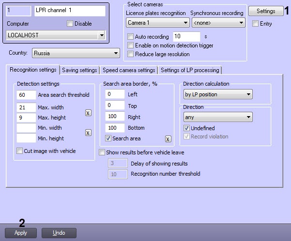 - Go to the LPR channel object settings panel, corresponding to the activated module (see Activating the software module used for identifying the plates section).