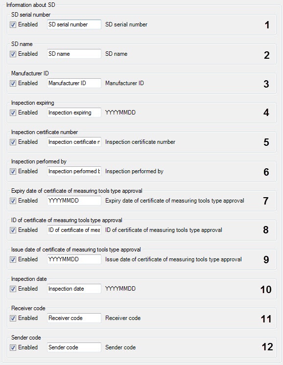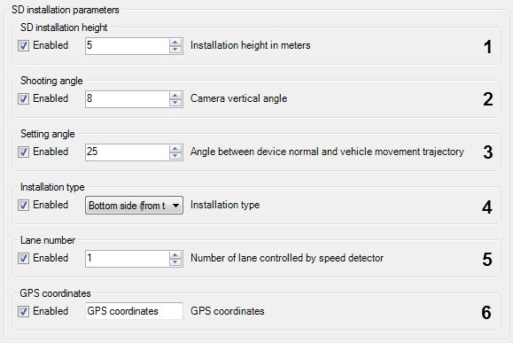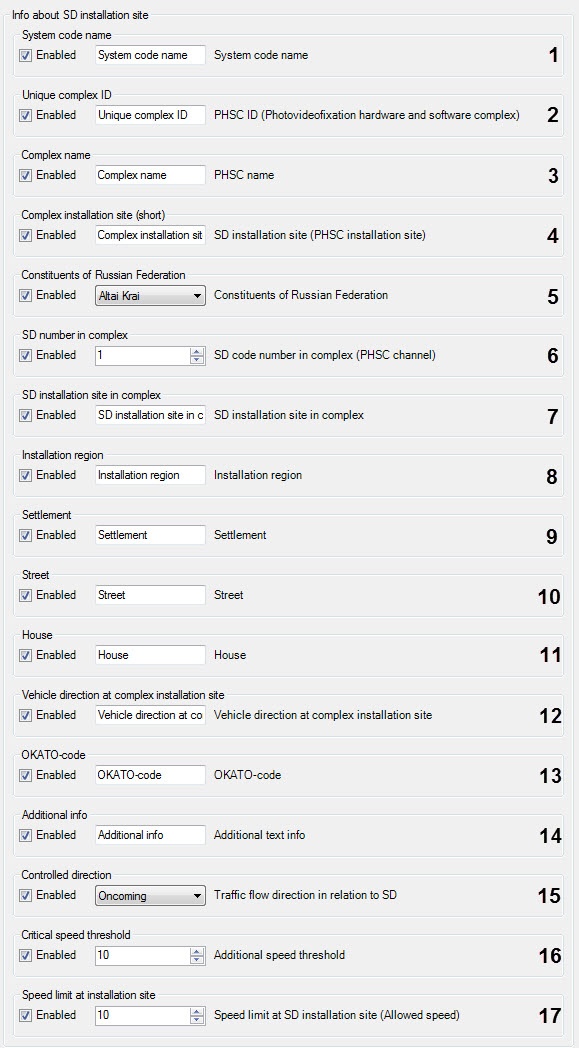 11 Receiver code Receiver code of the speed detector 12 Sender code Sender code of the speed detector Add one or several speed detector parameters to the frame sign. Put a tick in the Enabled checkboxes for necessary parameters in the Info about SD installation site and then enter in the field or select the values of corresponding parameters from the list.