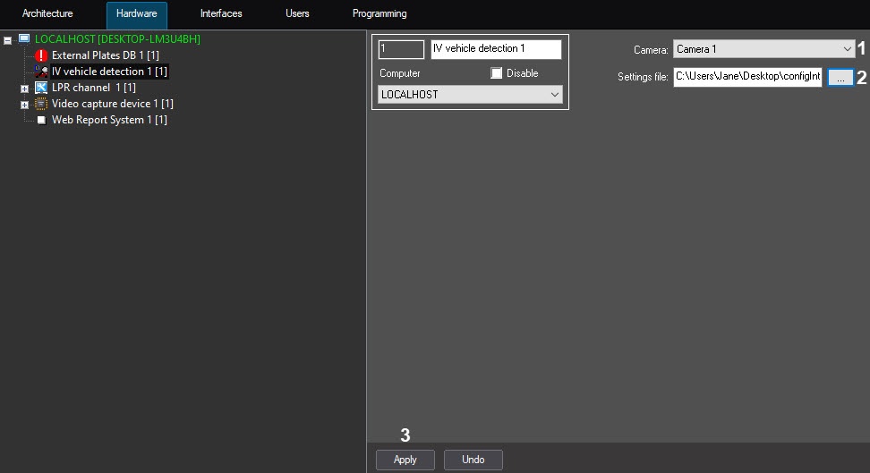 From the Camera dropdown list select the Camera object, corresponding to the camera of the IV vehicle detection (1).