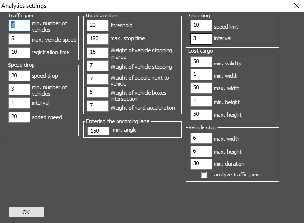 - Configure the parameters of the Traffic jam video analytics that detects road congestion and a sharp decrease in road capacity: