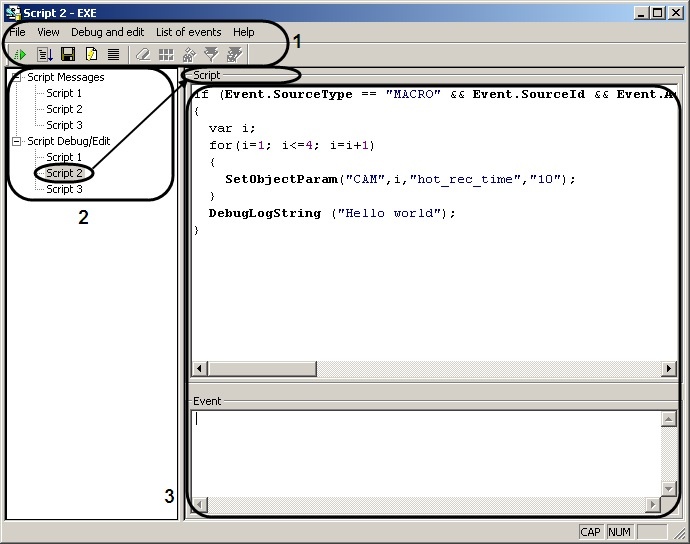 The user interface of the Editor-Debugger utility contains the main menu and the toolbar (1), the objects list (2) and the viewing/editing panel (3).