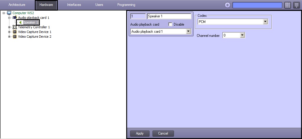 Several Speaker objects can be configured in the system. When the speaker is changed over using the Speaker list on the Computer object settings panel, then Intellect is to be restarted on the computer where it is in use.- Click the Apply button.