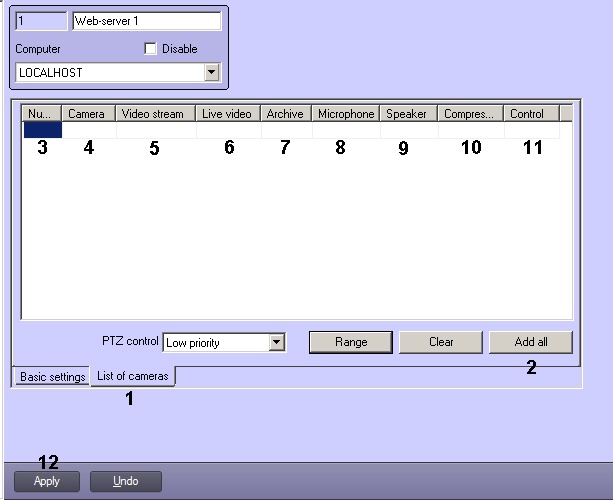 1. Go to the List of cameras tab on the settings panel of the Web-server object (1).