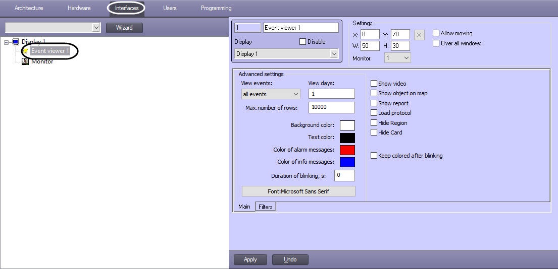 - Configure the displaying of the Event viewer interface box (see Parameters of displaying the Event Viewer interface box).