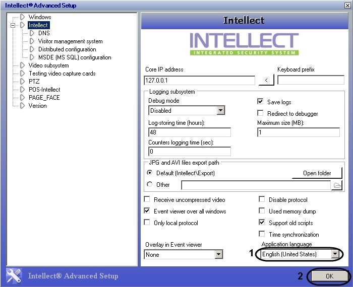 3. From the Application language dropdown list, select the desired interface language for the Intellect Software System (1).