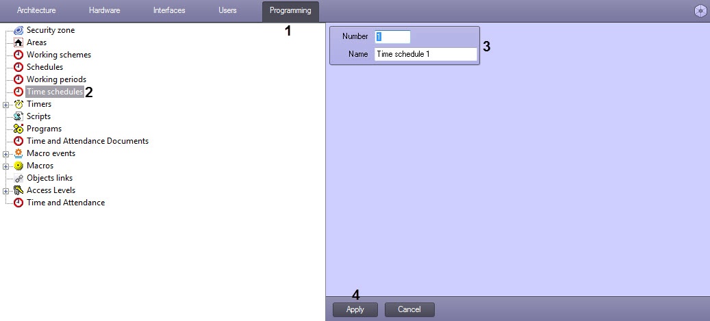 - Create the Time schedule object on the basis of the Time schedules object in the objects tree (2).