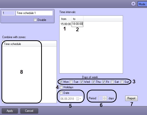 Specify the number and the name of the time schedule in the corresponding fields of the Time schedule identification panel (3).