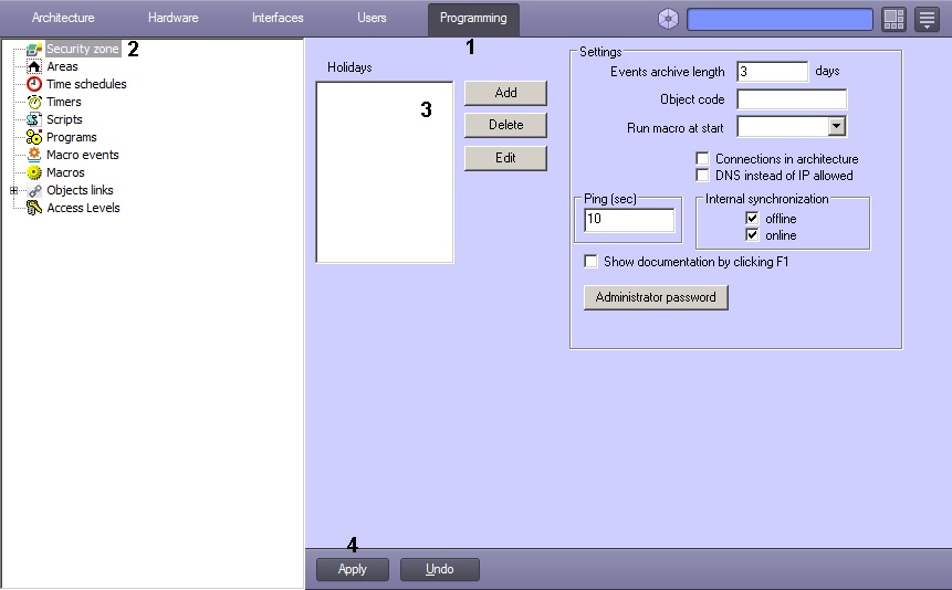 * The Holidays checkbox adds the list of days to the timetable specified in the Security zone object in the Programming tab.