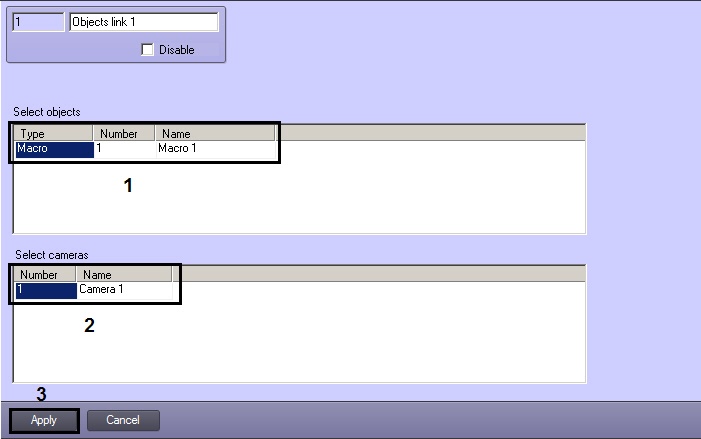 - In the Select object table specify type, identification number and name (is entered automatically after select type and id of camera) of all required objects.
