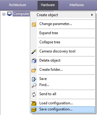 The Save configuration function allows you to save the current configuration parameters of an object to a file with the .cfg extension, so that these parameters can be used to configure other objects or to restore the configuration parameters of the current object after unexpected loss (for example, if an object is accidentally deleted).