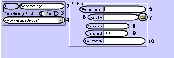 8 | Sensitivity | Enter the value into the field | Sets the maximum noise level in the phone handset, which prevents false identification of the noise as a reply of the voice message recipient | Sequence of numbers | 1 | From 1 to 10 |