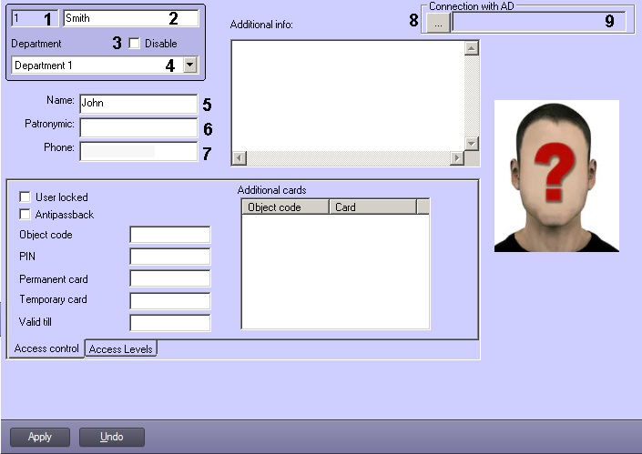 The settings of the User object are used to configure the access control system. It is usually changed using the Access Manager module in the ACFA Intellect subsystem (see Access Manager Module Settings and Operation Guide). In the Access Manager module you can also add the photo displayed on the User object settings panel.