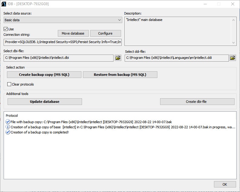 As a result, the intellect.sq.l.bak database backup copy is created in the folder specified as the value of the BackupFolder parameter (C:\ Documents and Settings\AVP\Desktop\Backup).