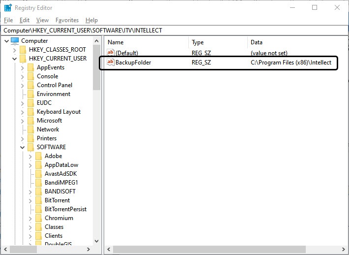 - Create the string parameter with the BackupFolder name in the «HKLM\SOFTWARE\ITV\INTELLECT» registry thread (see Adding string parameters to the registry).