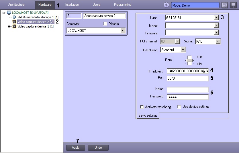- Create a Video Capture Device object under the Computer object (2). The settings panel of the object appears on the right of the System settings dialog box.