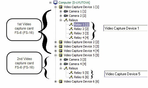 If the Sensor-Relay card is installed on FS-5, FS-6 or FS-16 video capture card, then the Relay objects are to be created under any Video Capture Device object within the hardware card.