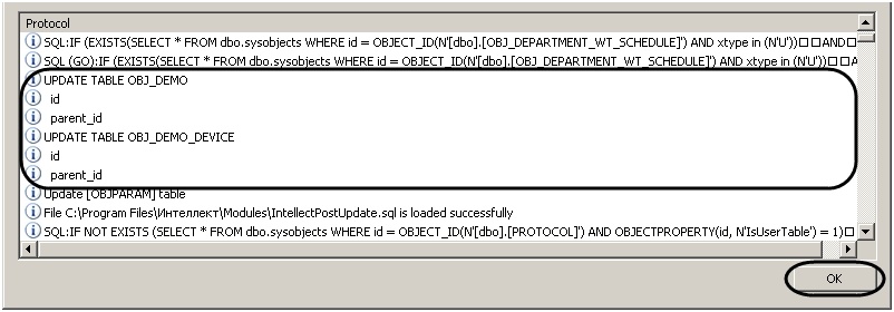 The system will start updating the database structure. The progress will be shown in the Protocol window of idb.exe. - Click OK to close idb.exe.
