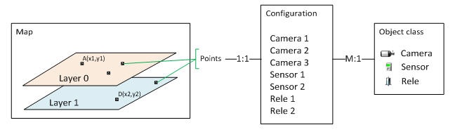 Several maps can be created on the server. Each map can consists of one or more layers. There are points on each layer. Each point corresponds to one of the objects in configuration.