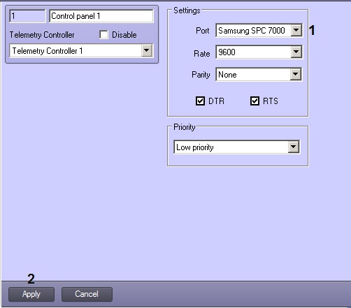 As the control panel is connected to the computer via USB, then you can leave default Speed, Parity, DTR and RTS settings.- To apply the changes click the Apply button (2).