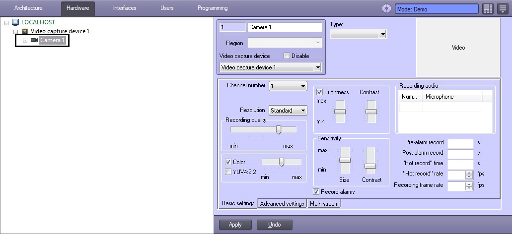 - Create the Video capture device based on the Computer object in the Hardware tab of the System settings dialog box (1).