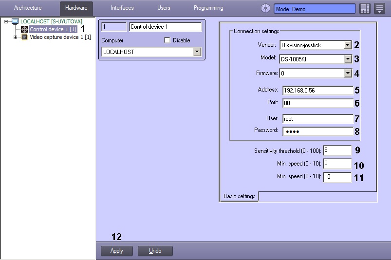 - In the Sensitivity threshold (0 - 100) field, set the joystick sensitivity threshold (9). The threshold is measured in the logical elementary shift units in the range from 0 to 100 and means the maximum shift along any of the axes at which the joystick movement messages aren't received by Intellect.
