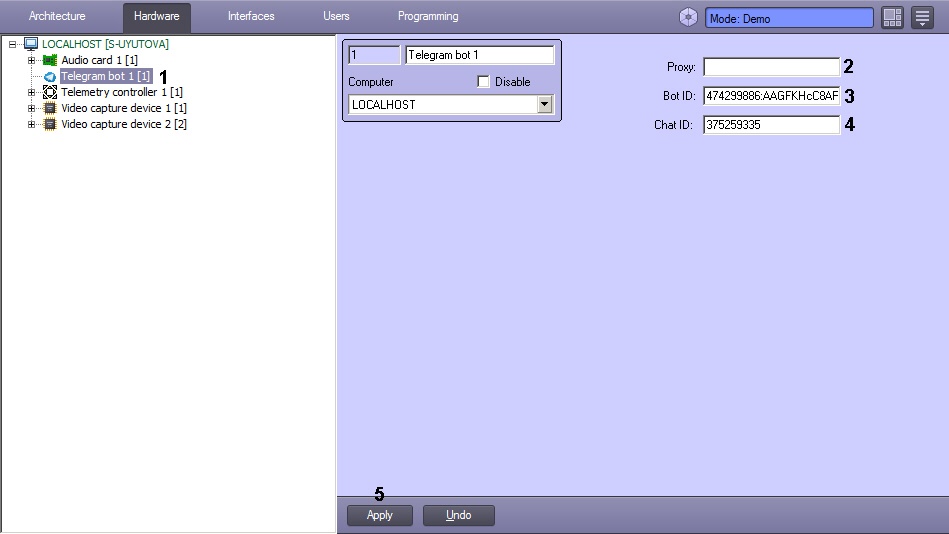 1. Create the Telegram bot object on the basis of the Computer object on the Hardware tab of the System settings dialog box (1).