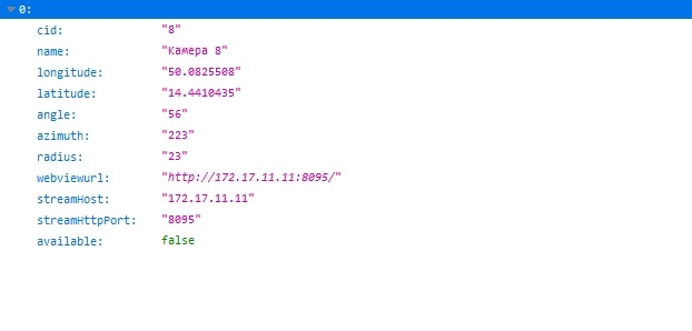If in the Additional information field on the camera settings panel is filled in the format coords:[longitude]:[latitude]:[angle]:[azimuth]:[radius], then this data will be returned in response to the request in the corresponding parameters. See also Additional information on camera.
