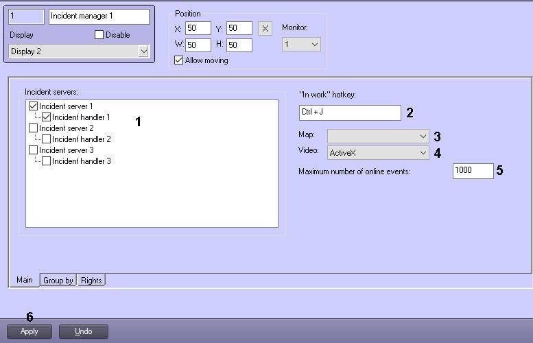 - From the Map drop-down list (3), select the previously created Map object, which will be linked with the Incident manager. The operator can make the object with the event be highlighted on the map.