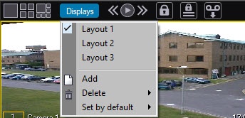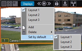 The Displays menu also allows assigning default layouts. The default layout will be displayed when Axxon PSIM is launched. Use the UseDefaultLayoutOnlyAtStartup registry key to display the default layout each time the corresponding screen with the Video surveillance monitor is displayed (see Registry Keys Reference Guide).