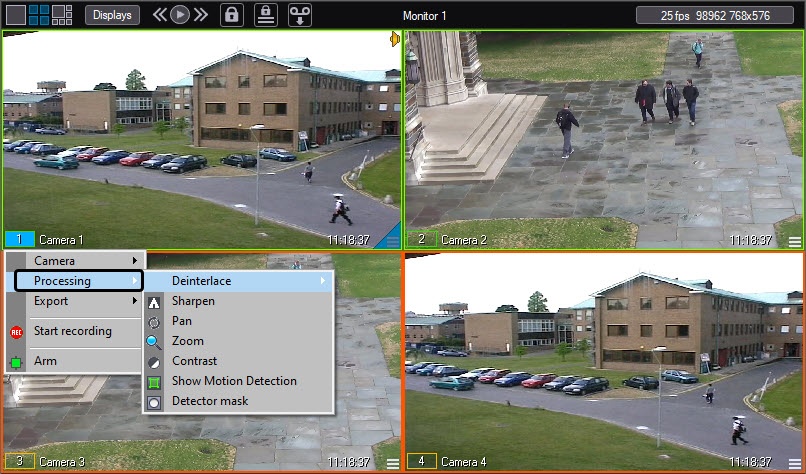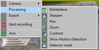 Image processing options are available through the video surveillance window functions menu: the Processing submenu displays options available for a given image.