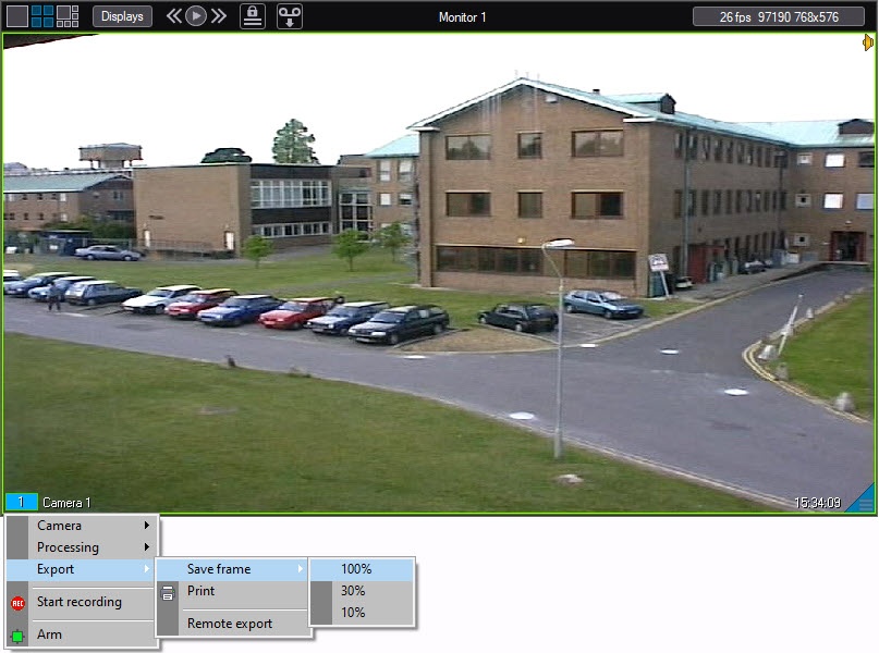 To save a frame, select the following in the functions menu of the surveillance window: Export → Save frame → Scale (100%, 30%, 10%). Here, the percentage defines the amount of video compression: