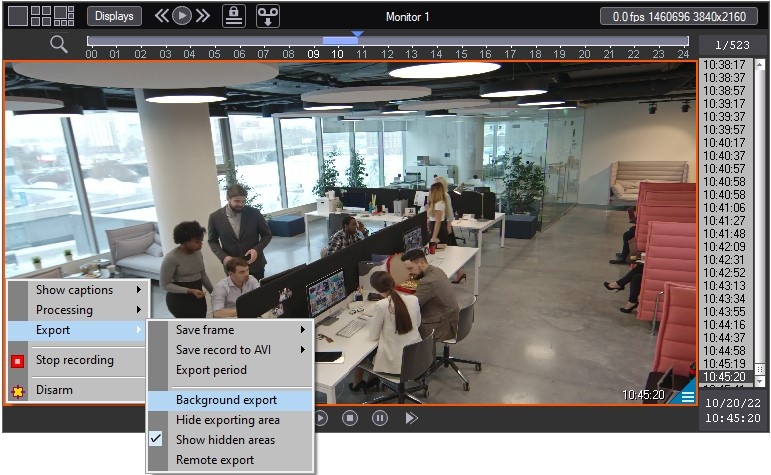 The button and the Export → Background export menu item aren't displayed if the disk for recording isn't selected (see Selecting the disks for video archive storage). They also are not displayed if the export is forbidden in the user rights.