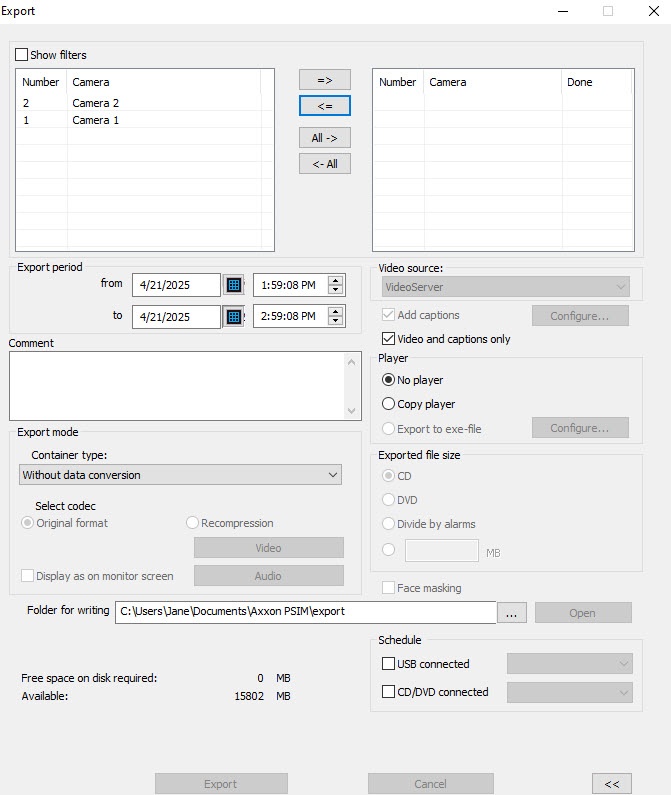 The AviExport utility is used for exporting video archive for the specified period in the format of the file system of Axxon PSIM, or in the AVI format with the possibility to change the coding format (codec). AviExport allows you to export the main archive, the videogate archive, and the backup archive (see General information on working with archives).