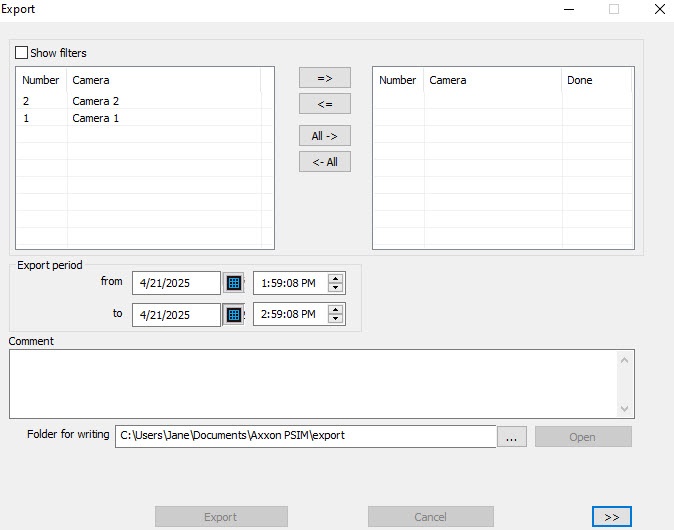 Click << in the bottom right corner to hide advanced settings, leaving camera selection and basic export settings only. At the next starts, the utility is launched in the expanded or basic mode depending on the mode it was shut down in.
