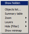 1. At the system configuration stage. Visible objects are always displayed on the Map, whereas hidden objects are displayed only in the hidden objects display mode. The hidden objects display mode is enabled using the Show hidden item in the Map function menu that you can access by right-clicking any place on the Map, which is free from object icons: