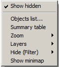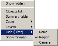 2. With the filter on the map layer. This filter applies only to the current layer and hides all objects of the specified type or the names of objects. Hiding and displaying objects is performed using the Hide (Filter) command in the Map function menu that you can access by right-clicking any place on the Map, which is free from object icons: