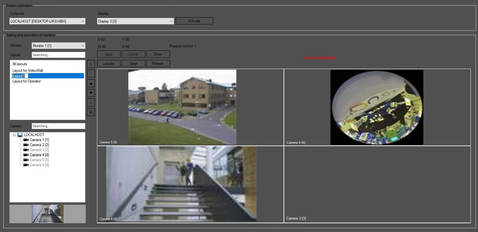 • To display the configured layout on the Video surveillance monitor, click the Show button. Prior to that, save the layout using the Apply button.