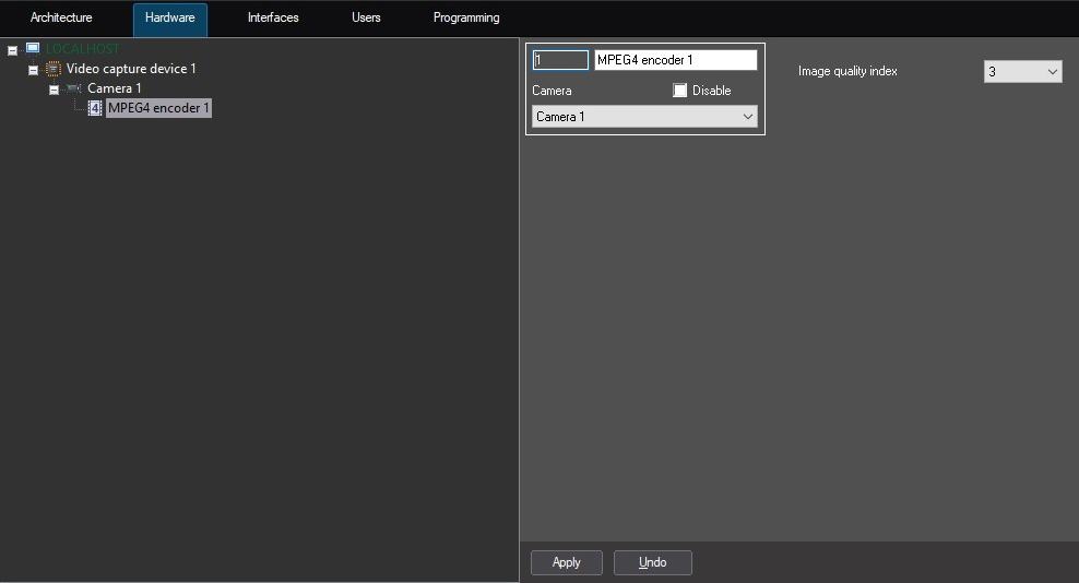 Setting up the MPEG4 Encoder object consists in setting the Image quality index parameter: it affects the archive video bit rate and, therefore, the size of the resulting archive file. The larger the index, the higher the image quality and the larger the archive file size. The default value of 3 allows acceptable bit rate for various video resolutions.