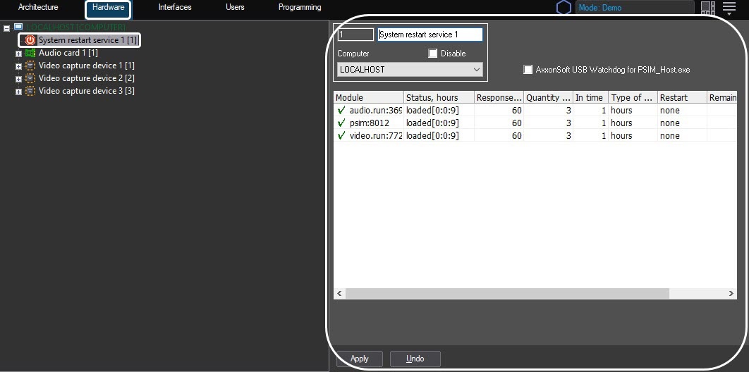 The system restart service is designed to control the workability of Axxon PSIM software modules and their restart if there is no response during the specified time interval. You can use both the program and the hardware workability control.