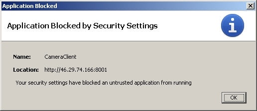 If the message appears when you try to access the Web-server saying that the application is blocked by security settings (see figure below), the Java security policy configuration is required for the computer on which you have received this message.