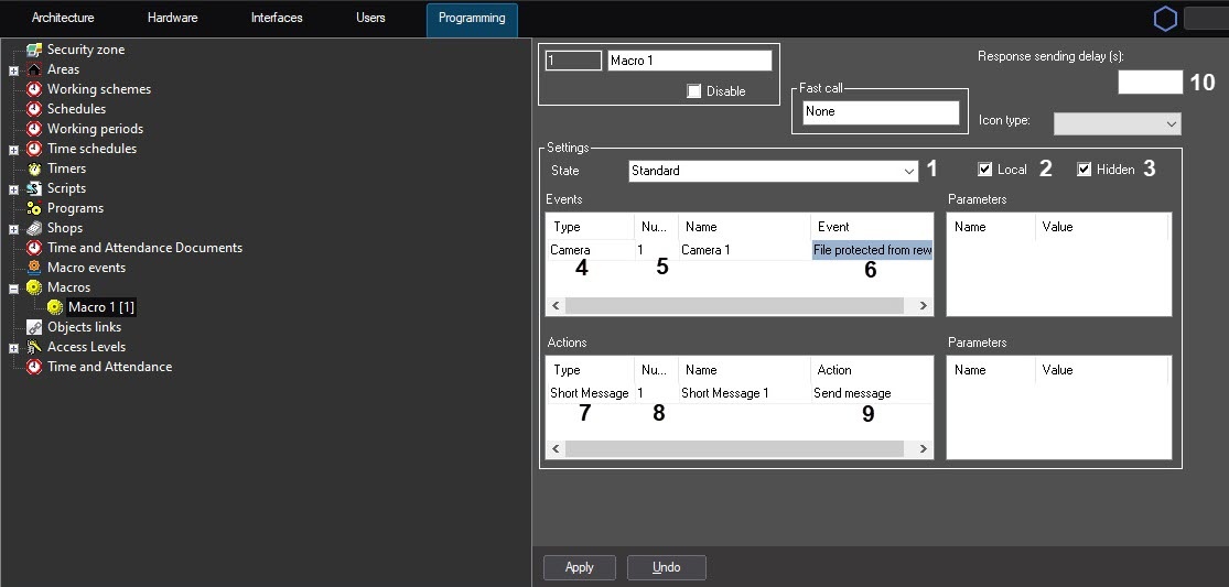 9. Select a number of the Short Message object that will be sent on a macro (8).