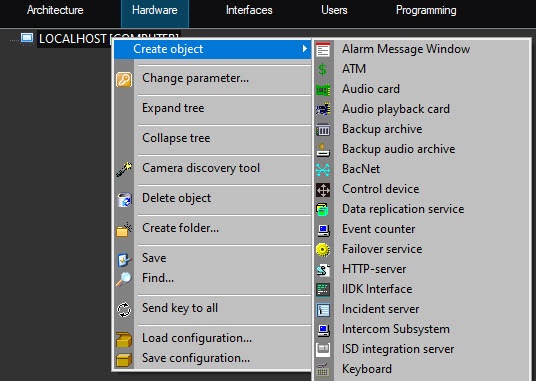 The Create object function is used to create a new system object in the objects tree in the Hardware tab. The function is selected from the context menu of the parent system object.