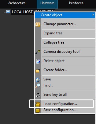 The Load configuration function allows you to load the configuration parameters from a file with the .cfg extension that was created using the Save configuration function (see Save configuration function). The configuration parameters can be applied only to the objects of the same type as an object used to create the configuration file.