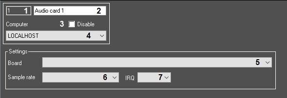 5 | The Board | Select the value from the list | Sets the type of the sound digitization device. Digitization devices include various sound cards, such as SoundBlaster, ADC of the video capture cards, USB devices for the audio signal digitization | List of the types of the sound digitization devices | NA | Depends on the number of audio signal digitization devices installed on the server.
