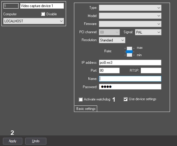 When SC300Q16 (FX4), SC300D16 (FX8) or SC310N16 (FX16) as well as SC330Q16 (analogue of SC300Q16) or SC330D16 (analogue of SC300D16) video capture cards are in use, set the Activate watchdog checkbox checked in the settings of every Video Capture Device object created for the card to which the Watchdog is connected.