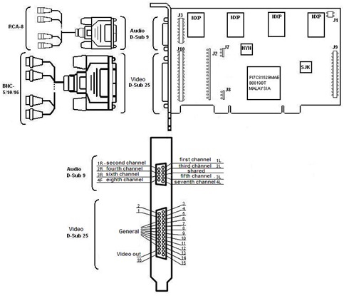 FS-6 video capture card has 2 external pins - D-SUB-9 and D-SUB-25. Video connection is performed with the help of D-SUB-25/BNC stub. Simultaneous connection of up to 16 cameras is possible. D-SUB-9/RCA-8 interface cable is used for connecting the audio channels (up to 8 sound sources simultaneously) to the external D-SUB-9 pin of FS-6 video capture card. Analog output card is connected to J2, J7, J8 pins. The Watchdog cable is connected to the J1 pin. The J9 pin is designed for connecting the 4/4 or 16/4 Sensor-Relay card (see Connecting 4/4 and 16/4 Sensor-Relay cards).