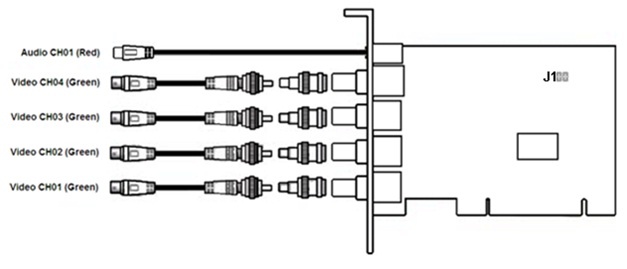 SC200Q4 (FS15) video capture card has five external pins– one TRS (3,5 mm, mini-jack) pin and four BNC pins. Cameras are connected via BNC pin. Simultaneous connection of up to 4 cameras is possible. Sound is connected via TRS pin. The Watchdog cable is connected to the J1 pin.