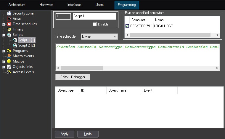 Moreover, you can configure the events filter—the list of events that the Script system object will process. Including the event to the filter equals to the if operator in the text of script, it means, when the event is in the table, the operator can be omitted.