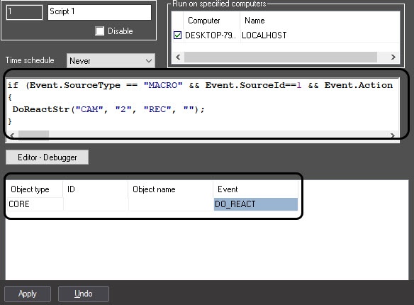 The settings panel of the Script system object allows choosing the time schedules and the computers (kernels) for executing the script.