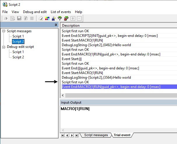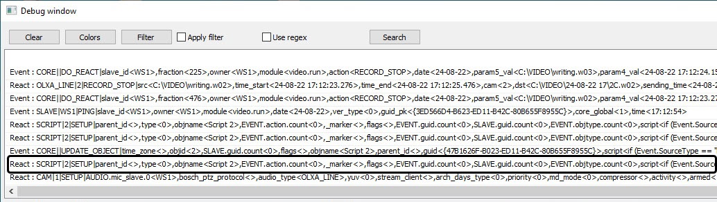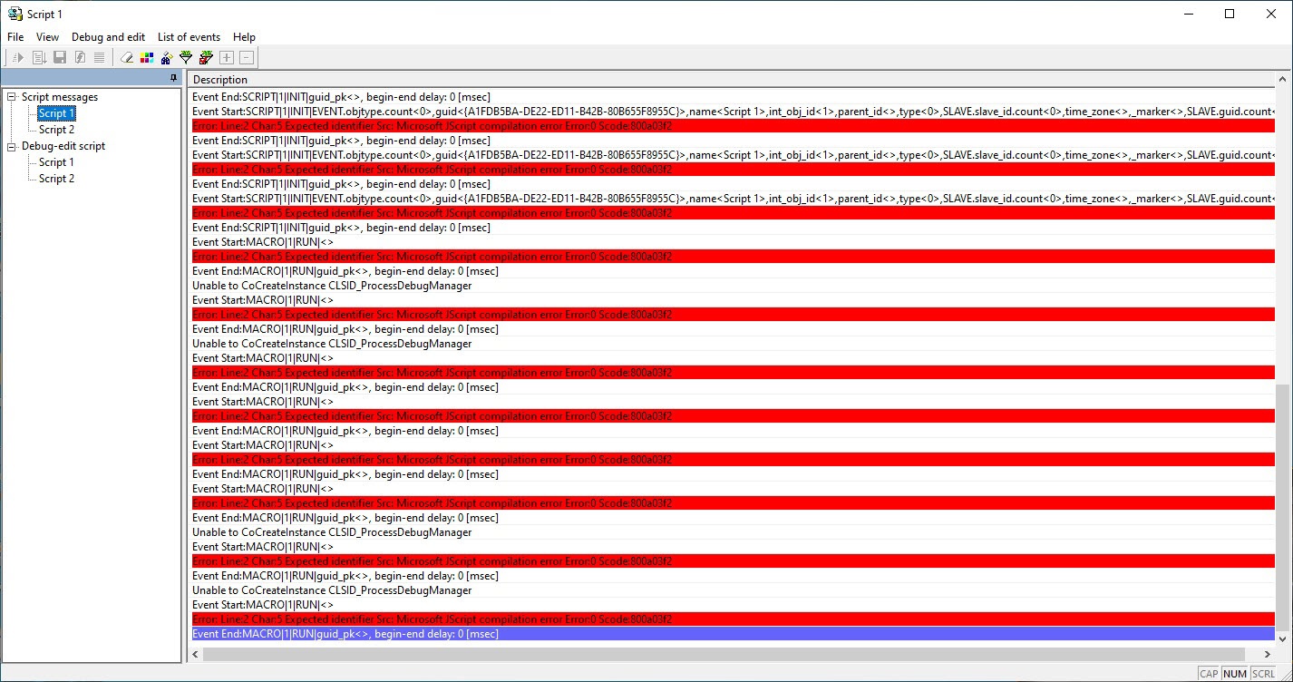 As an example of using JScript in Axxon PSIM, try to create a script containing an error and then correct it. The script performs the following actions: when Macro 1 starts, set the value 10 to the "Hot record" time parameter for cameras 1–4 and output the "Hello world" message to the debugging window of the Editor-Debugger utility.